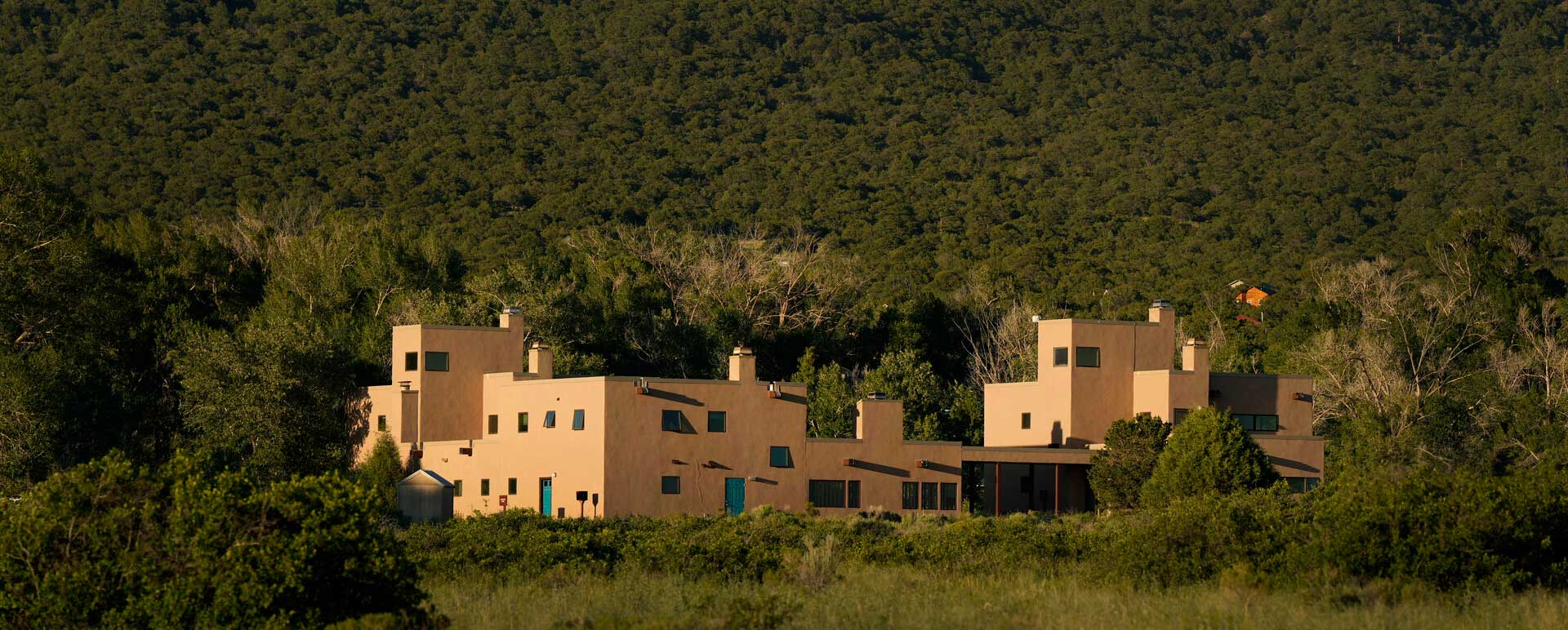 The sun warms both the outdoor terrace and the quarry-tiled lobby. Inside the center, two hexagonal meeting rooms are designed to accommodate either large (up to 70) or small (up to 16) groups in a sky-lighted area which is equipped with comfortable chairs, conference tables, a small computer lab, and audio-visual equipment. The conference center is located a short walk over Crestone Creek from the townhouses.